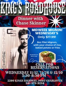 Dinner with Chase Skinner • Kings Roadhouse • Port Charlottewed10dec5:30 pm5:30 pm(GMT-05:00) Kings Roadhouse, 2200 Kings Highway, #3N