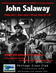 John Salaway Live at Phillippi Crest Club - Sarasotafri07nov7:00 pm7:00 pm(GMT-05:00) Phillippi Crest Club, 2421 Burlington Lane