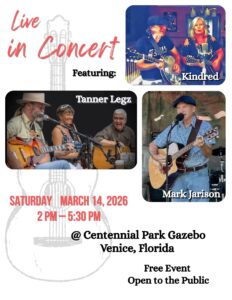 Live in Concert featuring Mark Jerison, Kindred & Tanner Legz - Centennial Park Gazebo - Venicesat14mar2:00 pm2:00 pm(GMT-04:00) Centennial Park - Venice, FL, 200 W. Venice Ave