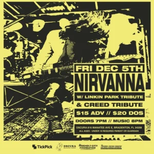 Nirvanna - A Tribute to Nirvana w/ The Linkin Park Tribute Band & Creed Tribute - Oscurafri05dec7:00 pm7:00 pm(GMT-05:00) Oscura, 816 Manatee Ave E