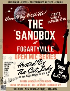 The Sandbox at Fogartyville - Open Mic Series - Hosted by The Cat Ladymon23mar7:00 pm7:00 pm(GMT-04:00) Fogartyville Community Media and Arts Center, WSLR 96.5 Community Radio, 525 Kumquat Ct