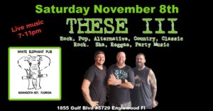 These 3 - Rock the White Elephant Pub - Englewood Beachsat08nov7:00 pm7:00 pm(GMT-05:00) White Elephant Pub, 1855 Gulf Blvd